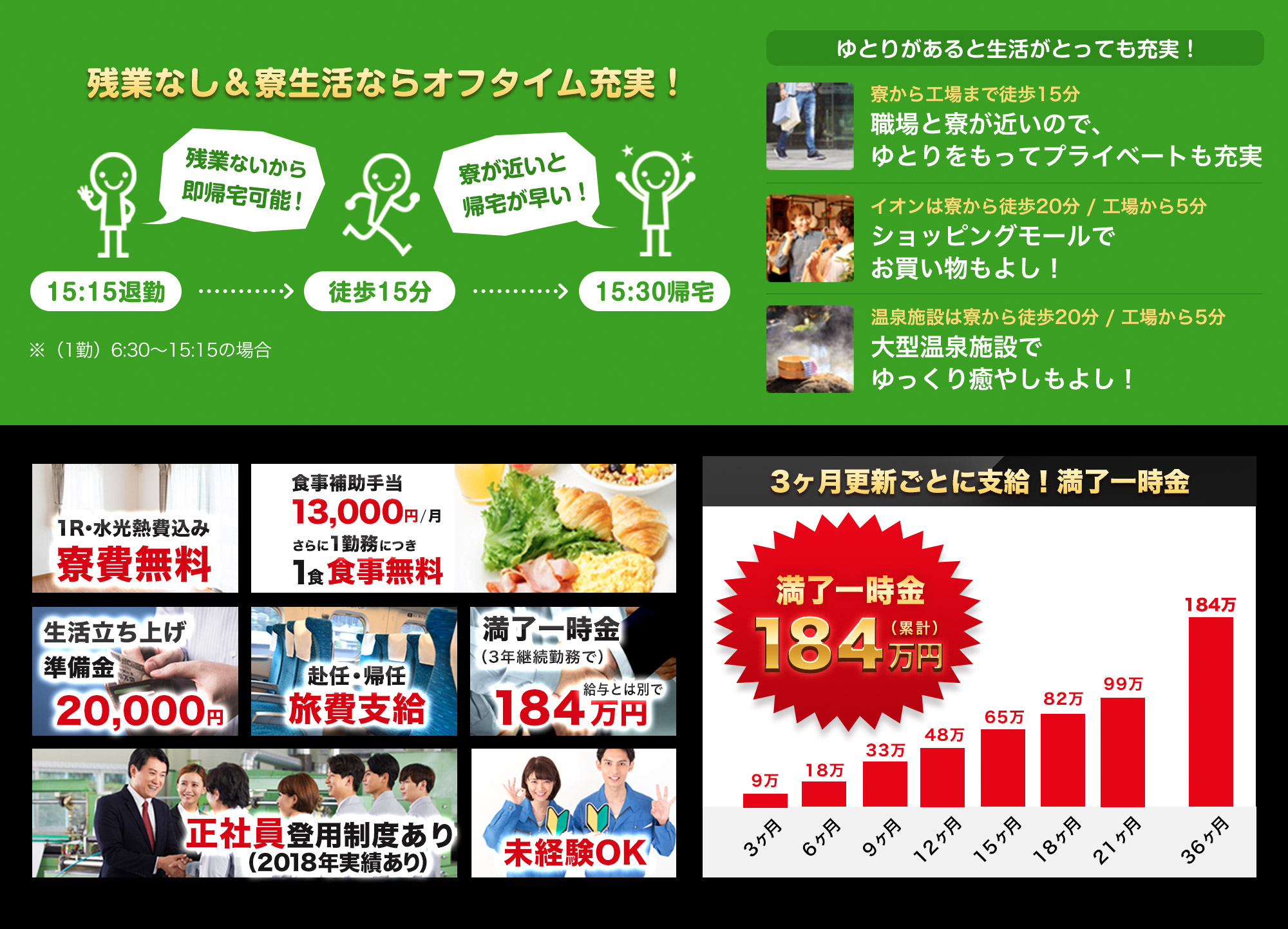 ◯社会保険(労働保険・厚生年金保険・健康保険)完備 ◯自宅通勤不可者については、当社規定に基づき入寮可能(寮費無料) ◯出勤日の休憩時間における食事は無料、その他食事補助支給有り ◯作業服無料貸与 ◯通勤手当あり(規定あり) ◯当社規定による各種手当(交替制手当・時間外勤務手当・深夜業手当・食事補助等)支給あり ◯赴任、帰任旅費支給 |